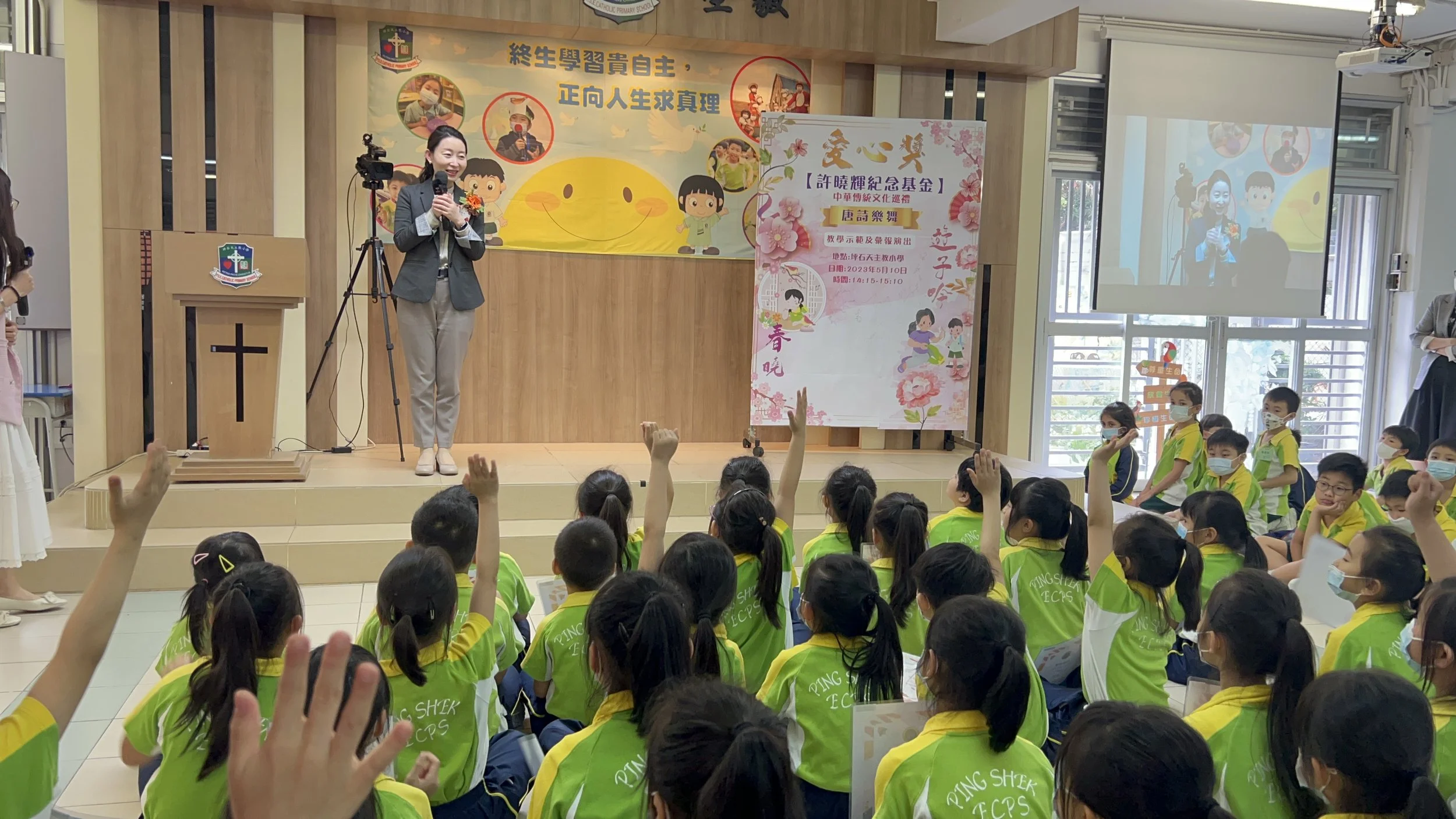 2023年5⽉10⽇由愛⼼獎「許曉暉紀念基⾦」⽀持並贊助,唐婭藝術⼯作室主辦的曉⽇春暉公益活動 - 中華傳統⽂化巡禮「唐詩樂舞」教學示範及彙報表演於坪⽯天主教⼩學成功舉⾏!40位來⾃基層家庭的初⼩同學們,從輕快活潑的《春曉》到深情、滿懷感恩的 《遊⼦吟》學習認真、表演投入,邊誦唱邊腳踏舞步,⼗分吸引眼球!