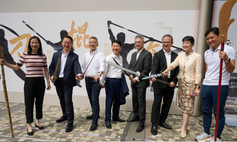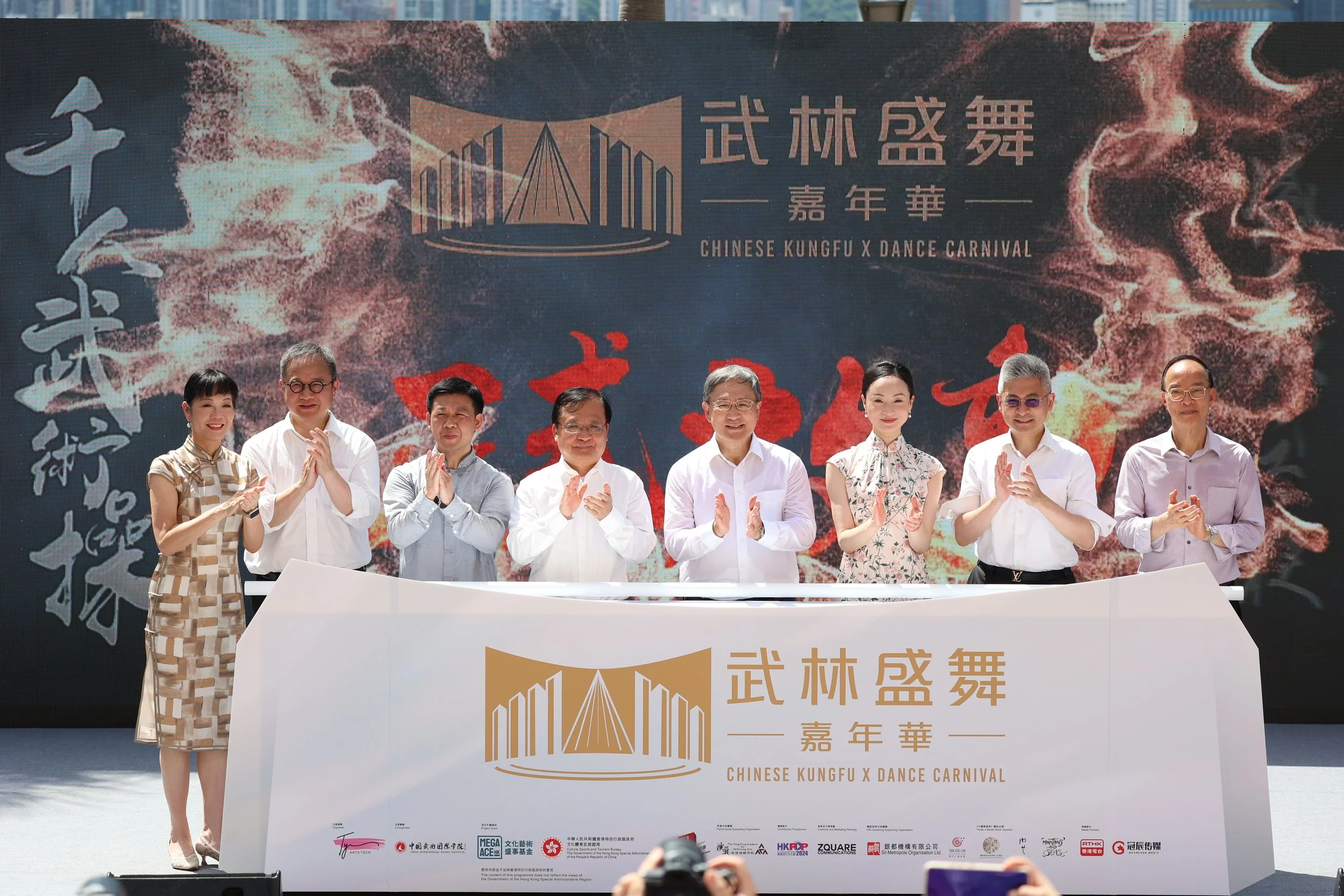 (從左向右依次為)文化藝術盛事委員會副主席 陳李藹倫女士、文體旅遊局常任秘書長 黃智祖先生、合辦機構 中國武術國際學院創辦人 黃宇帆先生、外交部駐香港特別行政區特派員公署副特派員 方建明先生、政務司副司長 卓永興先生、主辦機構 唐婭藝科創辦人 唐婭女士、文體旅遊局署理局長 劉震先生、立法會議員 馬逢國先生等一眾嘉賓舉行啟動儀式,正式揭開「武林盛舞嘉年華」的序幕。
