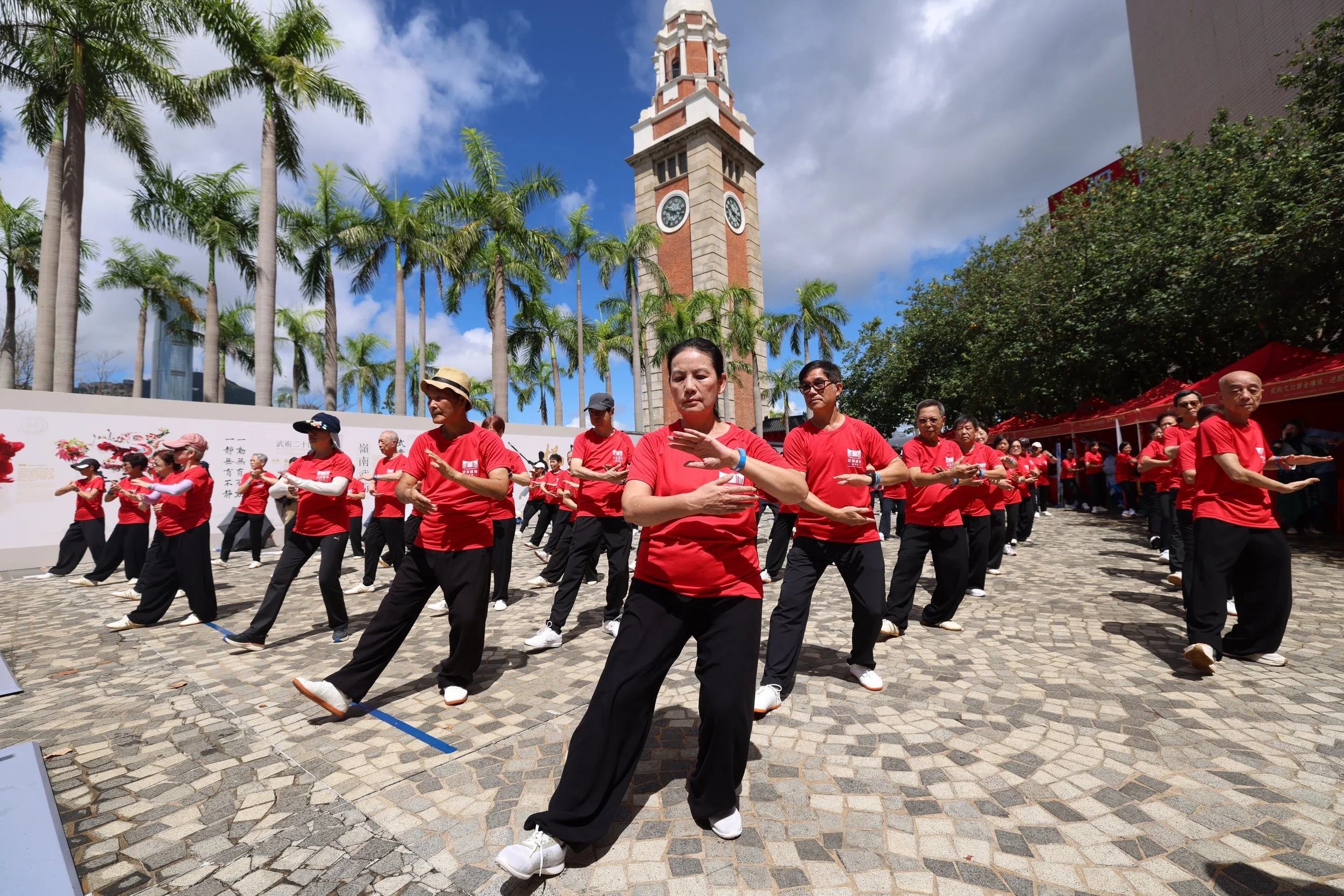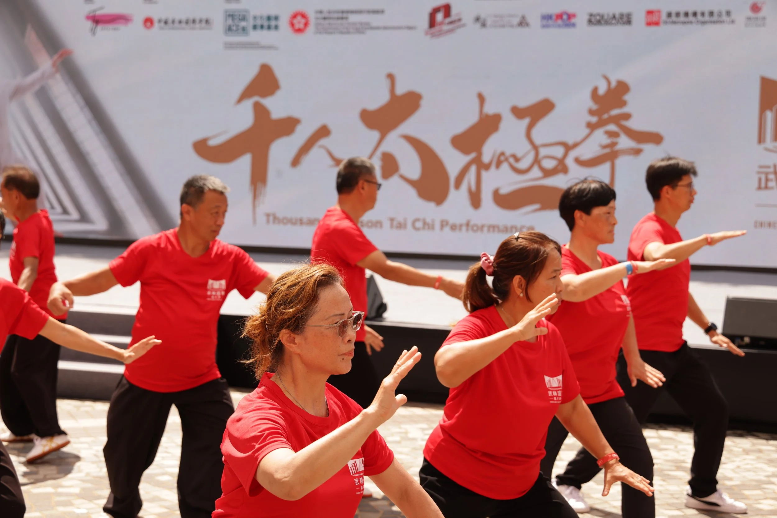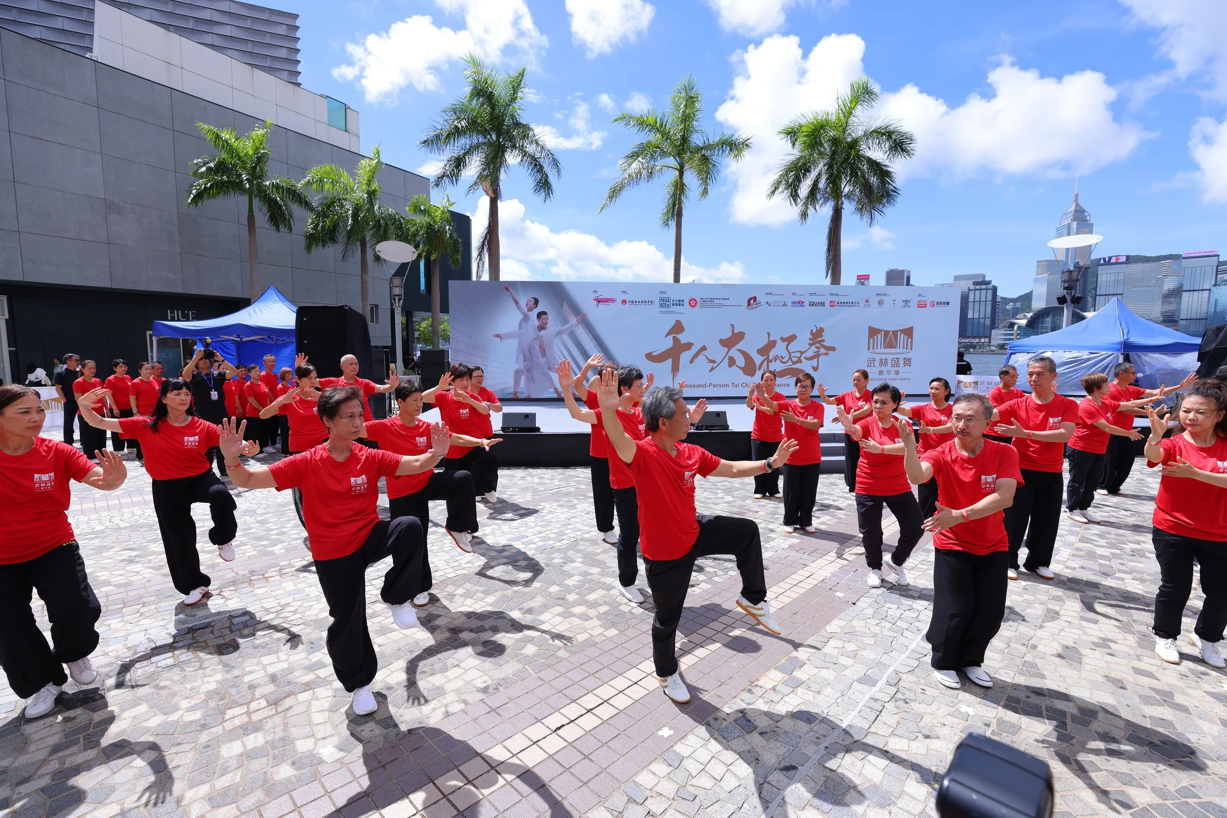 「千人太極拳」老中青表演者,展示以和為貴的太極文化,帶出社會和諧共融的信息。太極拳表演者來自23個香港太極團體,其中台前表演精英不乏香港知名太極拳師傅。